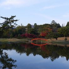 奈良ホテルに隣接する施設で広大な庭園が広がっている。1958年に国の名勝に指定されており、穏やかな水面に木々が映り込みきれいな風景。ちょうど紅葉の時期を迎えていたこともあって、色づいた木々がきれいだった。赤い橋もアクセントになった。