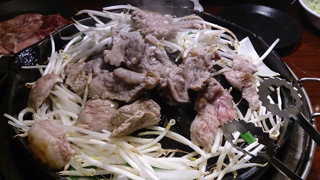 生ラム、モヤシなどの野菜、千切りキャベツ(手作りドレッシングもおいしかった!)、ライスが食べ放題!