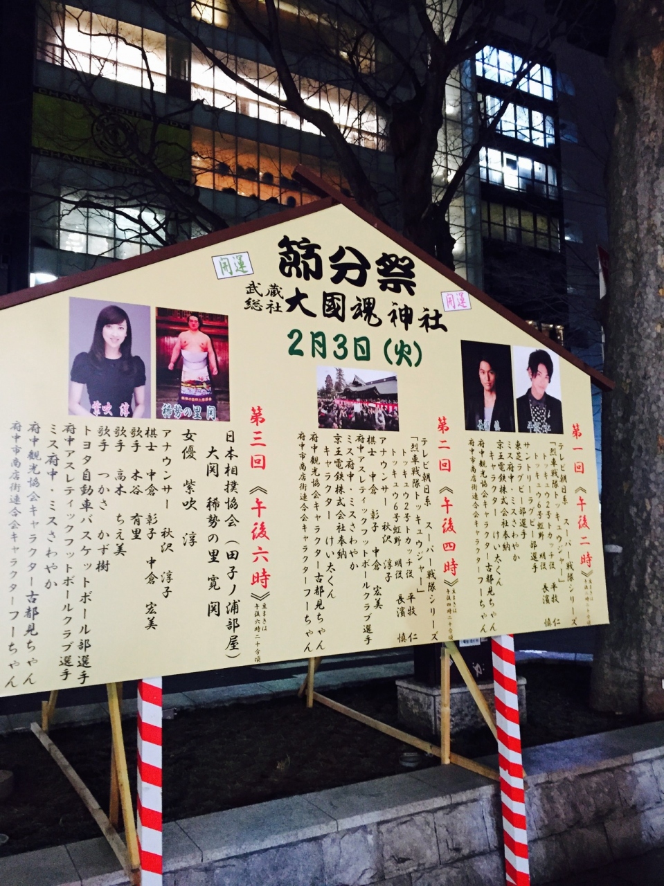 好天に恵まれた中、大国魂神社の節分祭に行ってきました。駅や参道には絵馬の形の掲示があり、気分が盛り上がります。