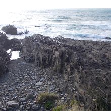 食事の後に海岸に出てみると、荒々しい地層のくっきりと刻みこまれた岩に波が打ち寄せていました。