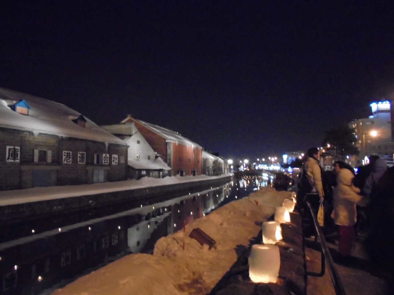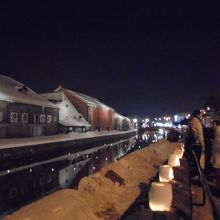 運河沿いはどの建物も同じレンガ造りですが篠田倉庫とかかれてあるのですぐ分かります。小樽雪あかりの路が開催されている時の夜に訪問しました。土曜日のだったのでかなり混んでいました。写真を撮るのもたいへんでした。人気スポットです。