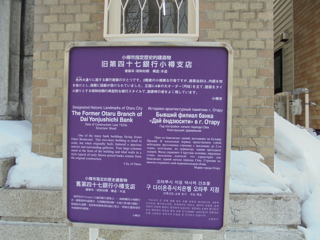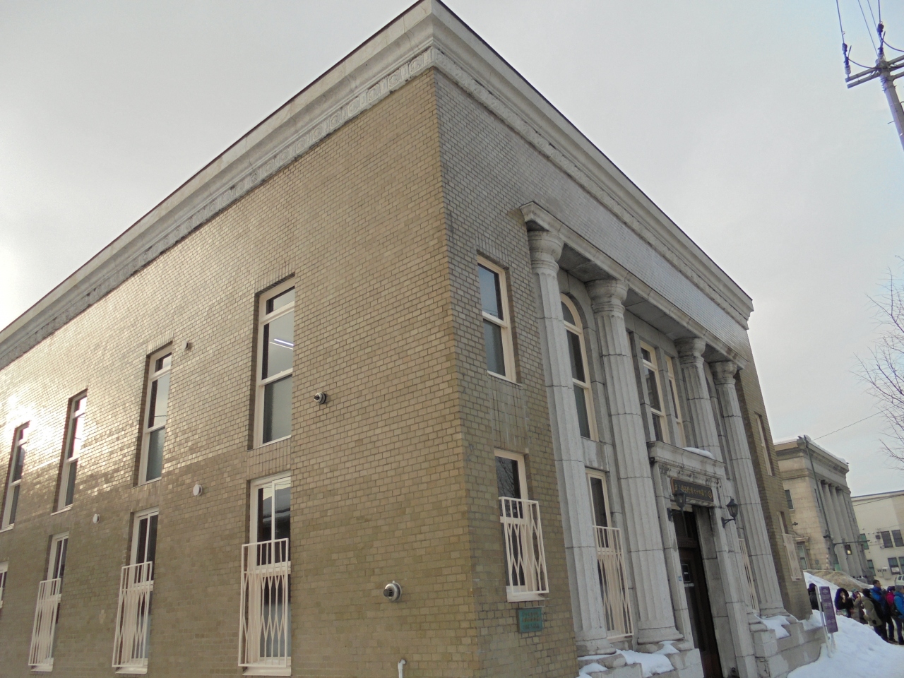 小樽駅から歩いて10分ほどでつきます。色内大通りに面しています。2階建てで小さめの建物ですが、当初は内部が吹き抜けで、周りに回廊があったそうです。正面にある4本の円柱オーダーは、昭和初期の典型的な銀行スタイルです。
