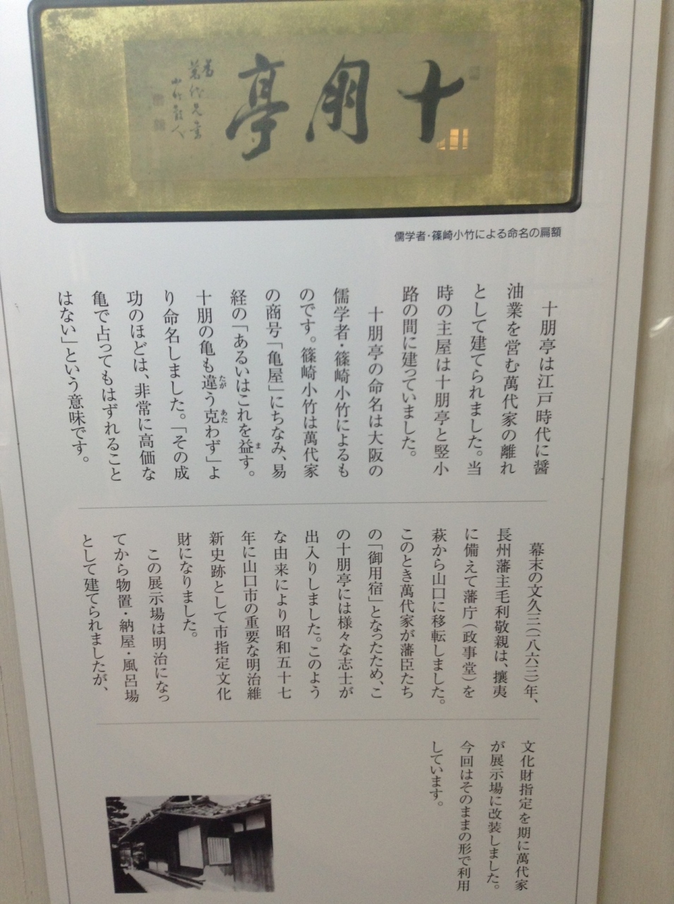 十朋亭は、山口市内の堅小路にある長州藩の御用宿だった建物です。もとは、醤油屋さんの離れだったものを幕末に藩庁を萩から移した時に宿所としたものだそうです。