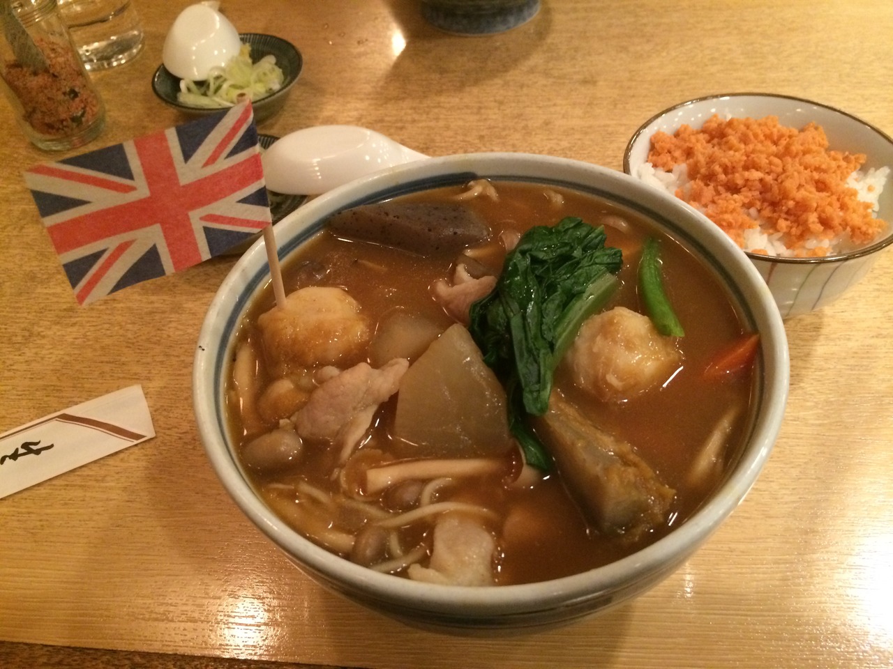 気軽に入れる大手町ビル地下の蕎麦屋です。オリジナルメニューもあり、夏はトマトカレーそば、冬はけんちんカレーそば、があります。写真はけんちんカレーそばです。国旗が野菜に刺さって出てくるところが意味不明ですが、味は美味しかったです。