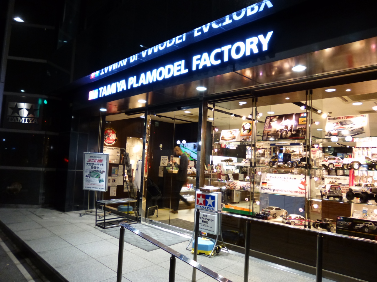 西新橋で食事をしたあと、近くを散策していると「タミヤ プラモデルファクトリー」の前に差し掛かりました。ショーケースが照らされているので、昼よりも目立ちます。