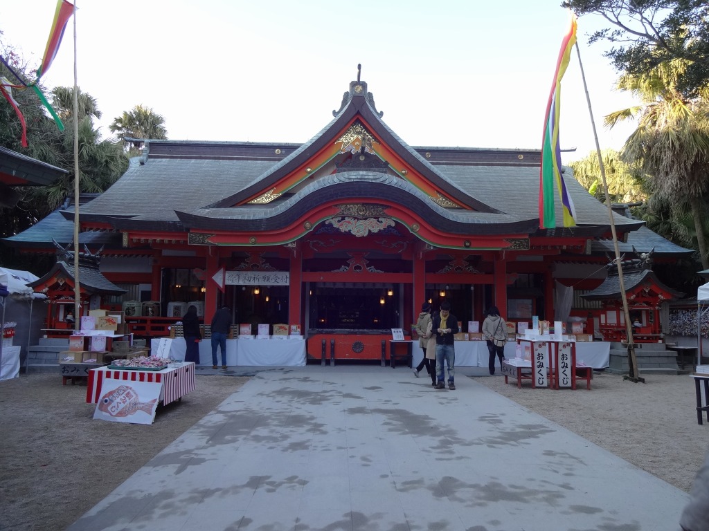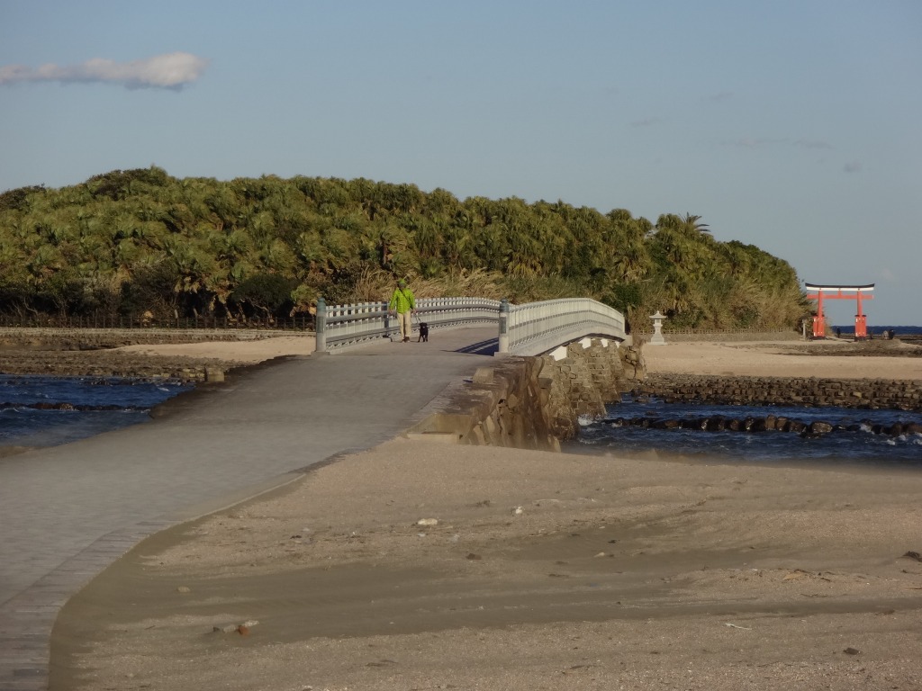 この神社は島にありますが、その周りは鬼の洗濯板ともいわれる奇勝で、砂岩泥岩互層が浸食によって形成された鋸歯状の海岸地形をしています。