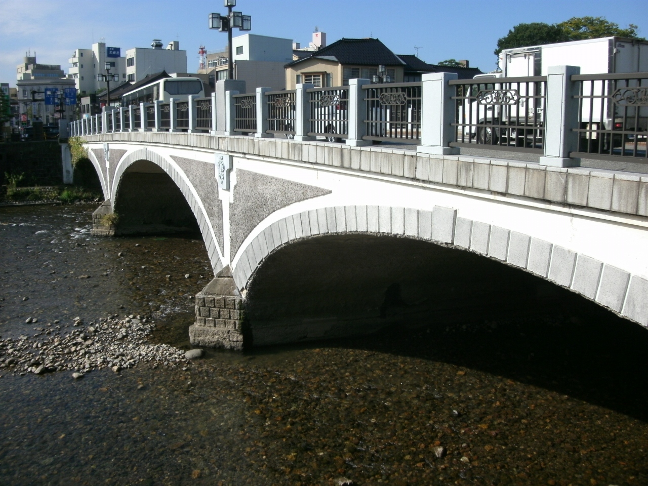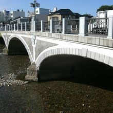 ひがし茶屋街の近く、浅野川にかかる長さ55m、幅17mの鉄筋コンクリート造り3連アーチ橋です。