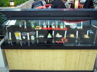 抹茶や小豆を使ったメニューが豊富の甘味どころ。国際線チェックインカウンター奥のエスカレーターで上階に登った江戸小路の最前列にあります。時代劇に出てきそうな江戸風情溢れるテーブルからは、下階のカウンターエリアが見渡せます。