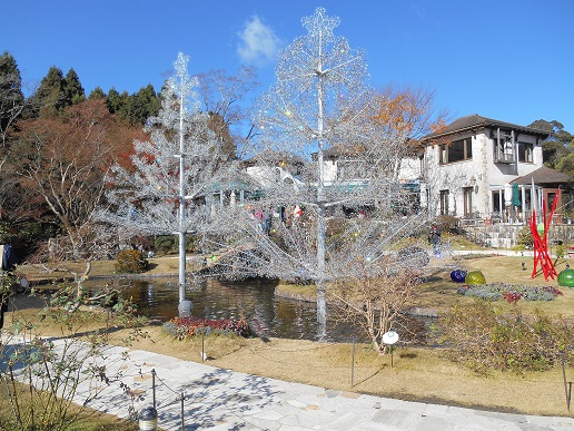 訪れたのは、12月でした。クリスマスにあわせてか、ガラスのクリスマスツリーが園内に作られていました。これがアンケートによると、かなり上位にランクされたものらしいのです。しかし、電源を使って光らせる他のツリーとは違って、ガラスの美術館ですからガラスに当たる光だけで輝かせているようです。