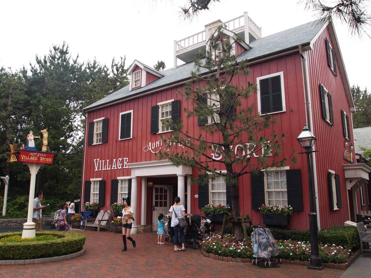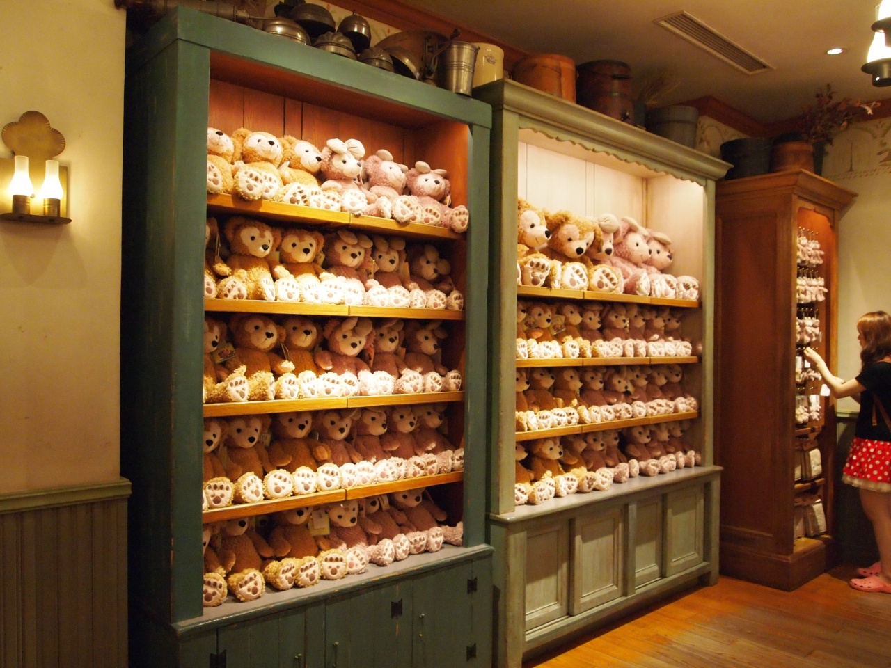 ダッフィーグッズの大洪水。可愛い赤色の壁が目印。