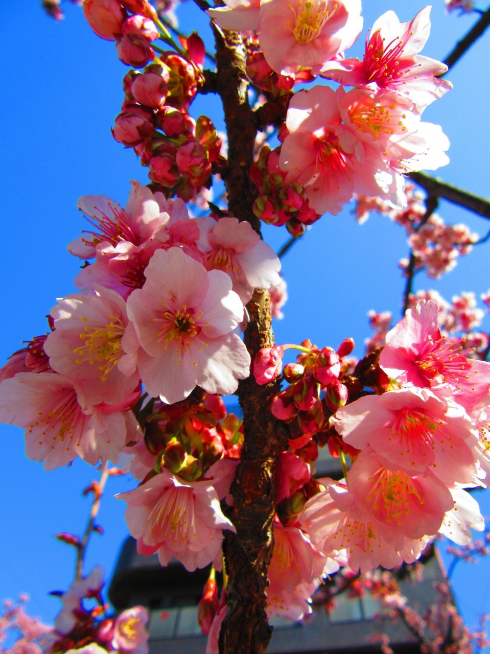 熱海市内の川沿い300メートルほどの糸川遊歩道にあたみ桜が咲いていています。あたみ桜はソメイヨシノより色が濃いピンク。