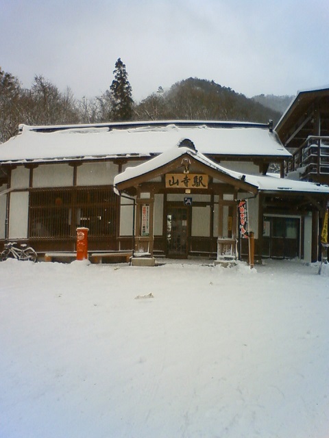 雪の階段を登って、降りて。帰ってきたのは二時間近くかかった後かも知れません。その間、待合室さんは荷物を見張っていてくれたようで、同じ場所にそのままありました。ありがとう、山寺駅と待合室さん。