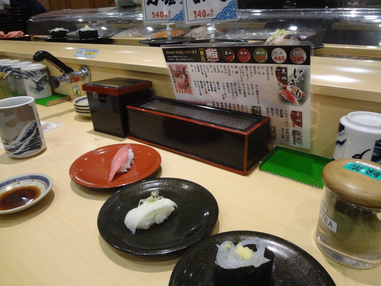 海鮮丼などもありますがメインはやはり回転寿司です。カウンターに座ってメニューを見ながら気に入ったものを注文してました。回転寿司なのでお皿に乗ってくるくる廻ってきますが、注文すればその場で板前さんが握ってくれるので、そうしてました。だってそのほうが美味しそうですから。ネタはかなり豊富です。値段も一皿140円から。もちろん2貫乗っかってます。美味しかった。