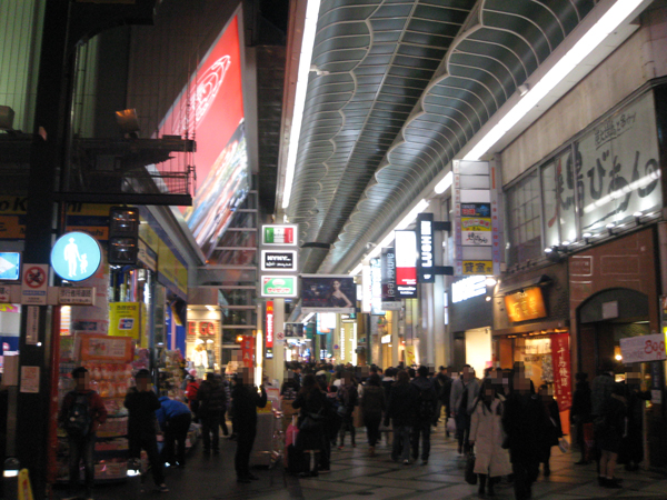 戎橋から北へ、御堂筋と並行にある商店街です。アーケードなので雨の日は便利。