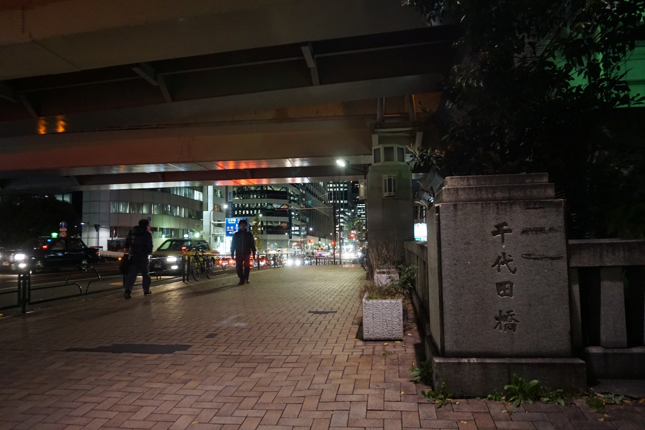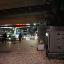 千代田橋は、日本橋1丁目と日本橋兜町を結ぶ橋で、旧・楓川に架かって永代通りを通します。永代通り自体が大正15年に開通したもので、歴史はそうないのですが、今では主要道路になっているので、この橋もそれなりに目立ちます。がっちりした橋だし、何か歴史を秘めていると思ったのですが、見た目と違ってそこまでの古さではありません。