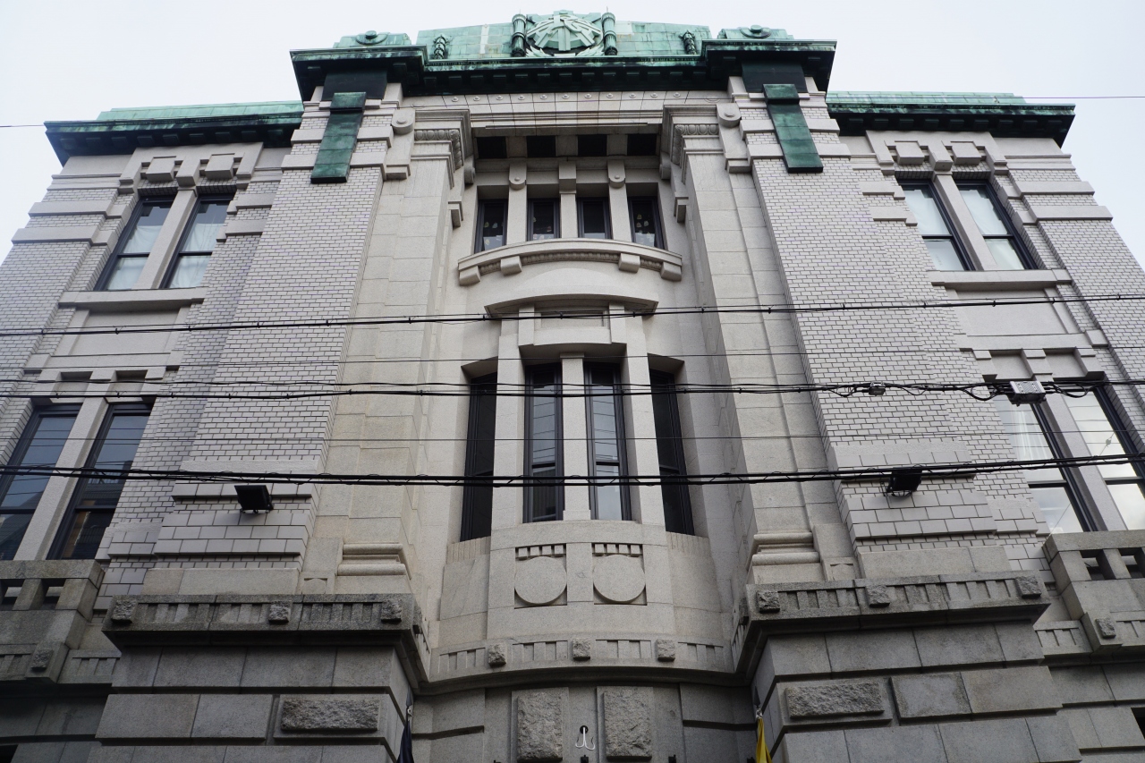三条通り沿いにあるSACRAは、旧不動貯金銀行京都支店をリニューアルしたもの。大正期の建物で、1階が煉瓦造、2・3階が木骨煉瓦造。国有形文化財に登録されています。細かい幾何学模様で装飾された外壁が特徴的。力強さより、装飾に力を入れたビルでしょう。