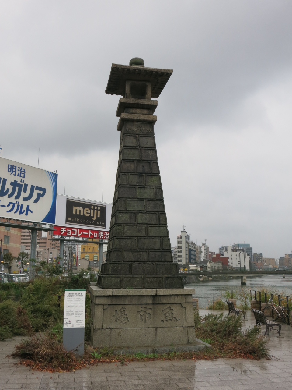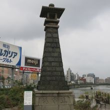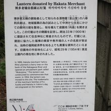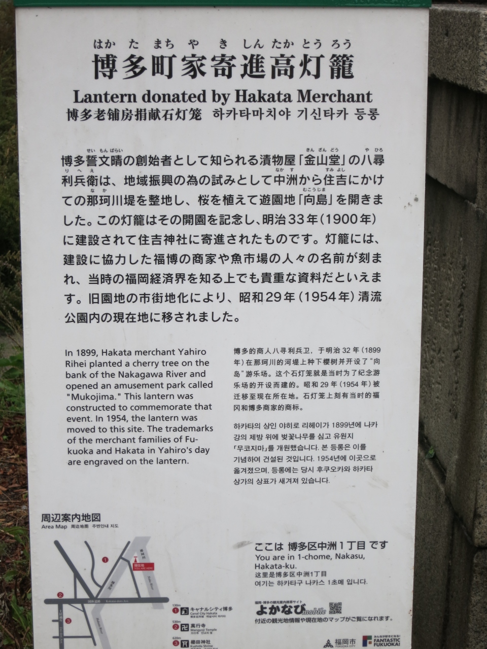 キャナルシティの正面、博多 中洲の南端 清流公園に立つ10m程の高さの灯篭です。説明文には、漬物屋「金山堂」の八尋利兵衛が遊園地「向島」を建設した際に記念として建てられたものと書かれています。灯篭の土台には魚市場と書かれており、近寄ると灯篭の石積みにも沢山のお店の名前が書かれており、昔の広告塔の役割をしていたそうです。