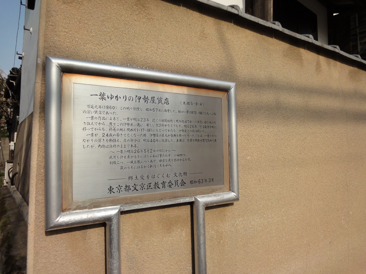 樋口一葉がかよったという質店の跡地です。近くに住んでいた時に質屋を利用し、その後にいわゆる終焉の地に戻ってからも御縁は続いたそうです。若くて才能のある方が質屋にかよっていて、24歳で亡くなってしまうというのも寂しい気がしてしまいます。