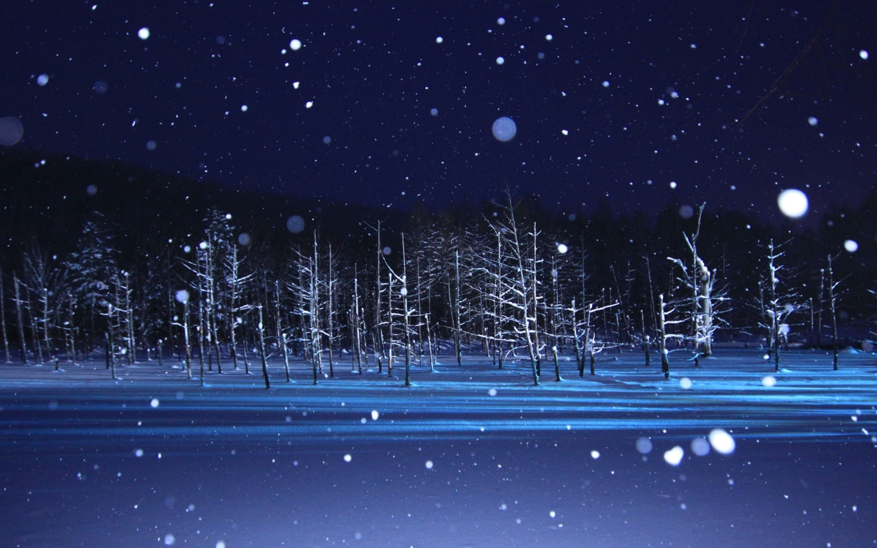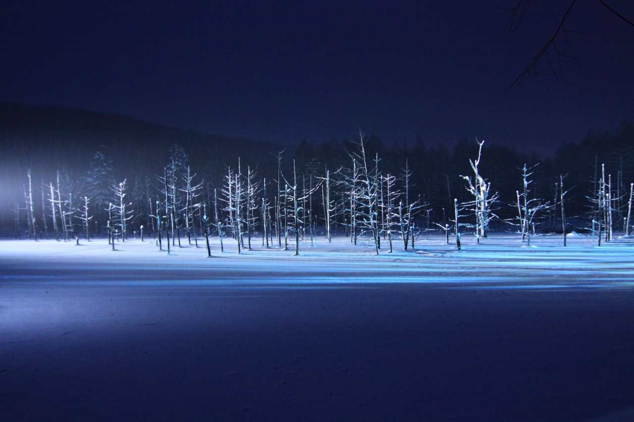 16時になるとライトアップ開始。白や青の光線が数秒おきに凍った湖面を幻想的に照らします。「青い池」は雪がつもって白い池になっていましたが、その雪模様も美しく、静寂な光のショーに寒さを忘れて魅入ってしまいました。