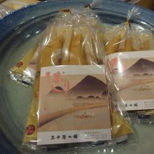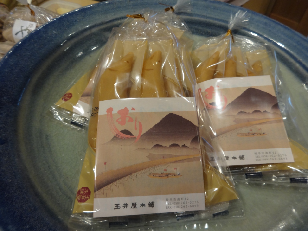 十八楼の宿泊のお茶菓子に出ていた「登り鮎」が美味しかったので、旅館の人に尋ねてみたら、十八楼を出て直ぐの所にある「玉井屋本舗」の商品を分かりました。旅館の売店で売り切れだったので、玉井屋本舗に直接、行きましたが一般には販売されていなくて、観光を終えてから旅館に再度行って買うことが出来ました。