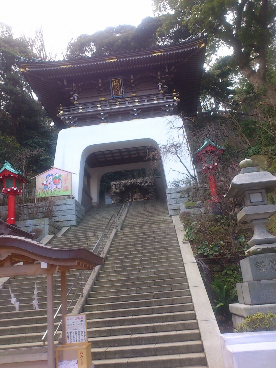 江ノ島に入って、弁財天仲見世通りを歩いて行くと、大きな赤い鳥居が出てきます。この鳥居をくぐると石段があり、それを登って行くと、竜宮城を模したこの瑞心門があります。江ノ島神社(辺津宮)の門になります。そんなに大きな門ではありませんが、とても印象に残ります。