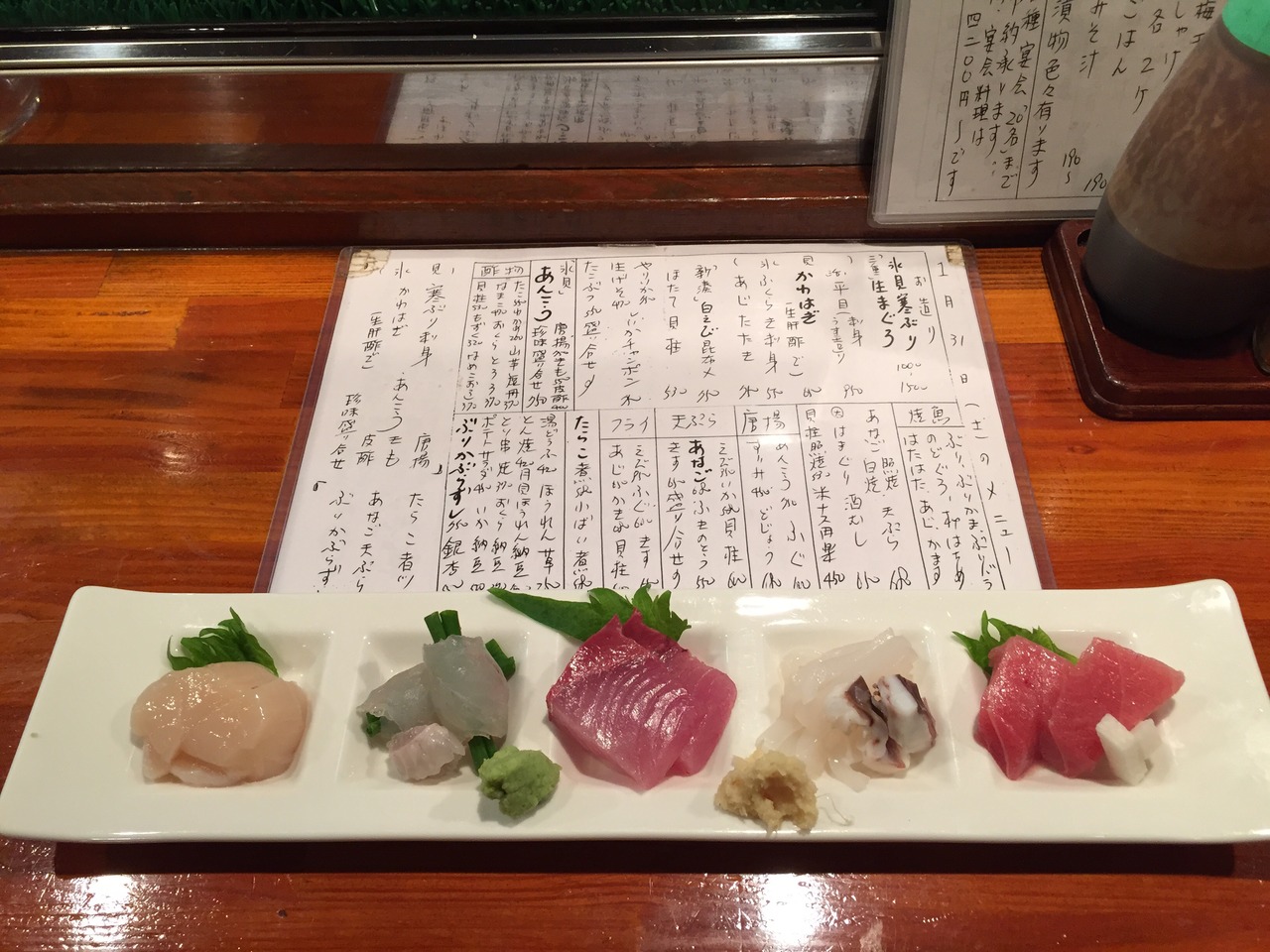 一番人気の 造りの盛り合わせ は オシャレな器に5種類 少量の刺身で いろいろ楽しめてよい。
