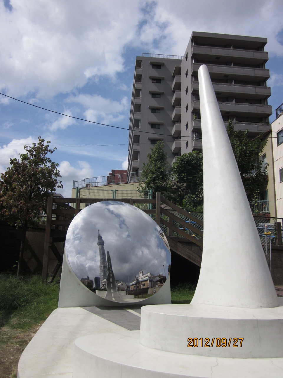 大きなステンレスでできた凸版鏡と、ユニークな形をした白いオブジェがあり、鏡に映る面白いスカイツリーを撮影することができました。
