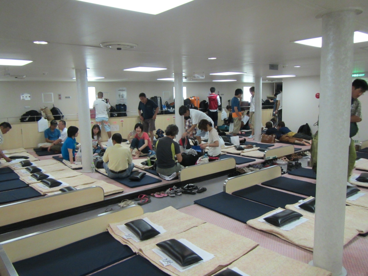 小笠原諸島に片道25時間半かけていきます。館内には売店、スナック、レストラン、ビデオルームなどがありますが、使ったのはレストランぐらいです。船室は一番安い二等。雑魚寝です。私は船酔いしやすいので、ほぼ寝てました。船酔いに強く、退屈しやすい人は暇つぶしの道具必須です。