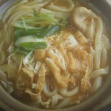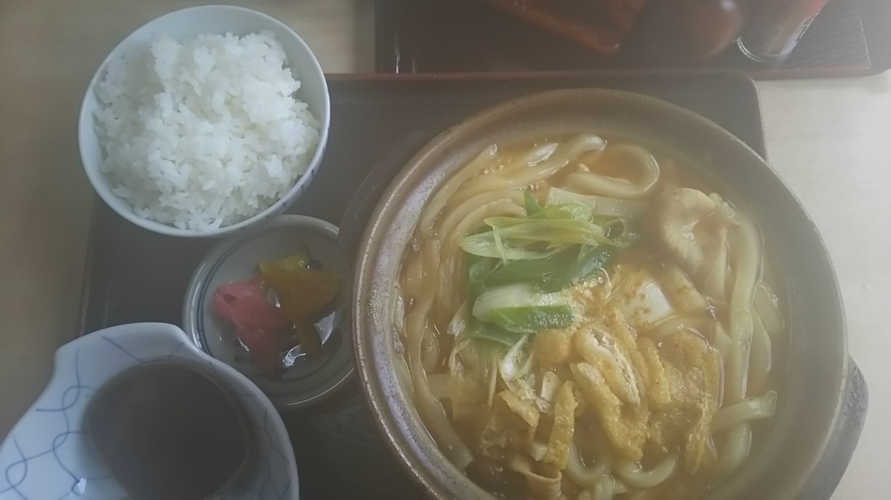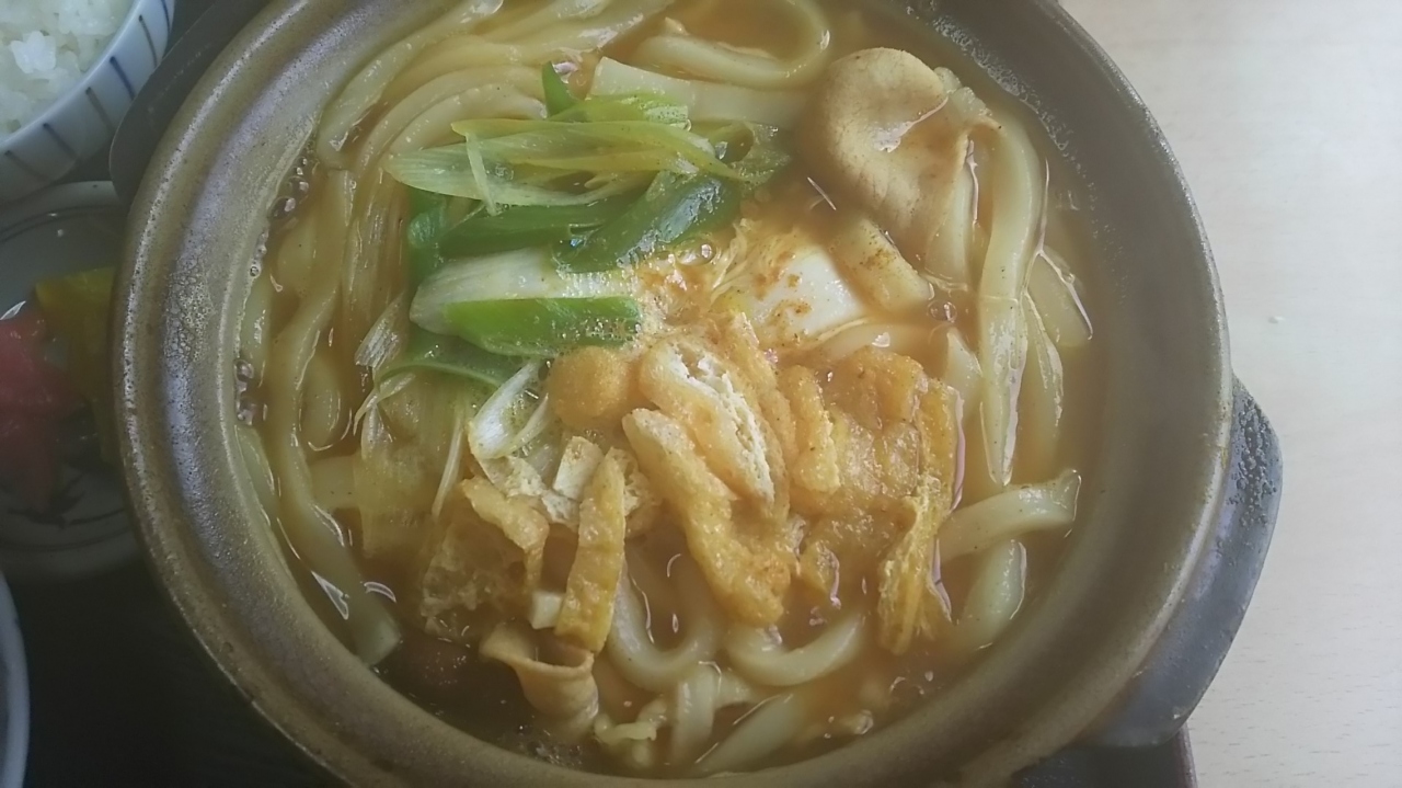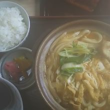カレー鍋焼きうどん定食を頼みました。ぐつぐつと煮立ったあつあつの状態で出てきました。しかし、麺が柔らかすぎて自分の好みには合わなかったかな。