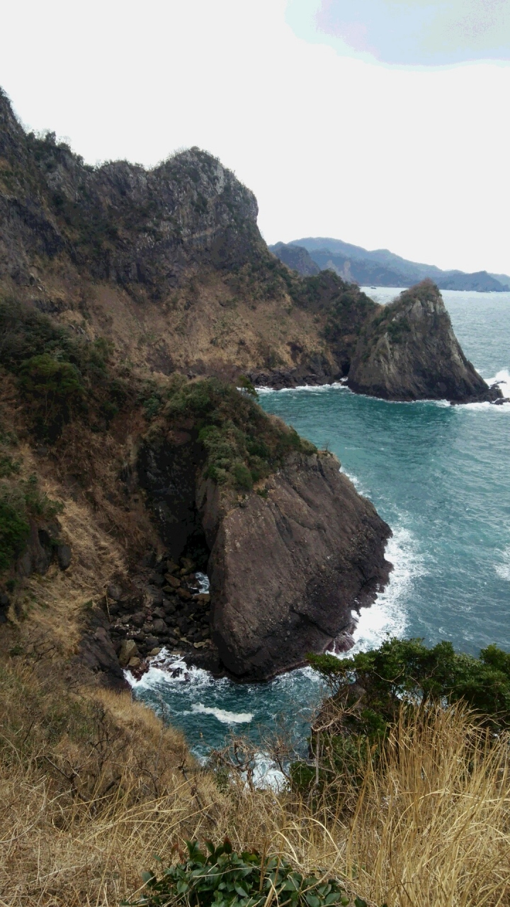 ここからの景色は270度のパノラマ。期待以上の以上の大絶景。日本海の大きさと迫力に圧倒された。千賊断崖にうちよせる波と大きくあいた穴。おそらく洞窟になっているのだと思う。その日の朝まで城崎温泉にいたので、何か別世界に感じた。