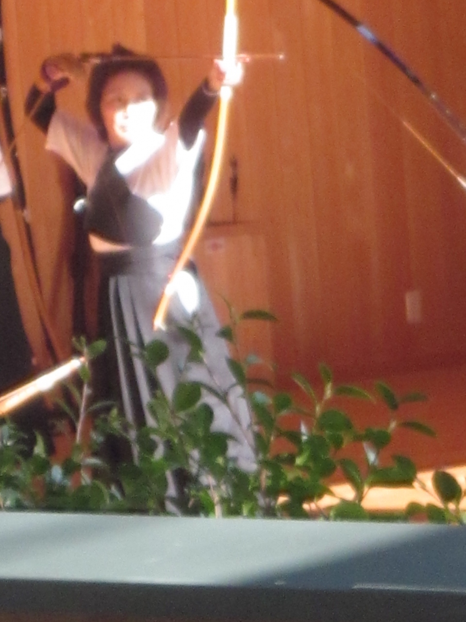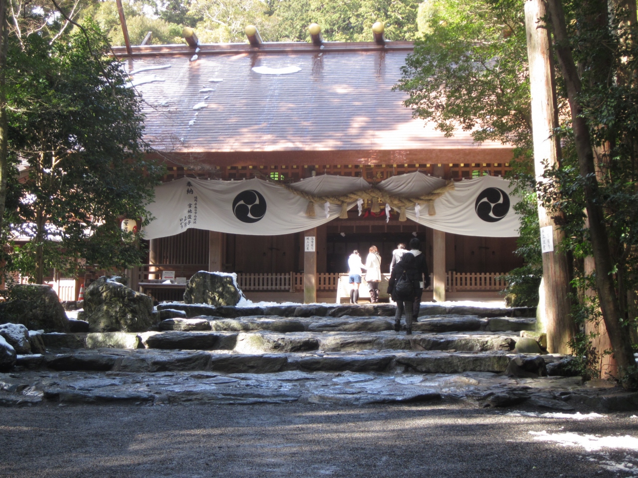 巨大な杉の木におおわれた参道を進むと、大きな本殿が現れ格式の高さを感じました。参拝帰りには回り道をして別宮に立ち寄りましたが、その向こうの弓道場でたまたま修練の場に出くわし、実際にはあまり見たことがない弓道を間近に見ることができました。