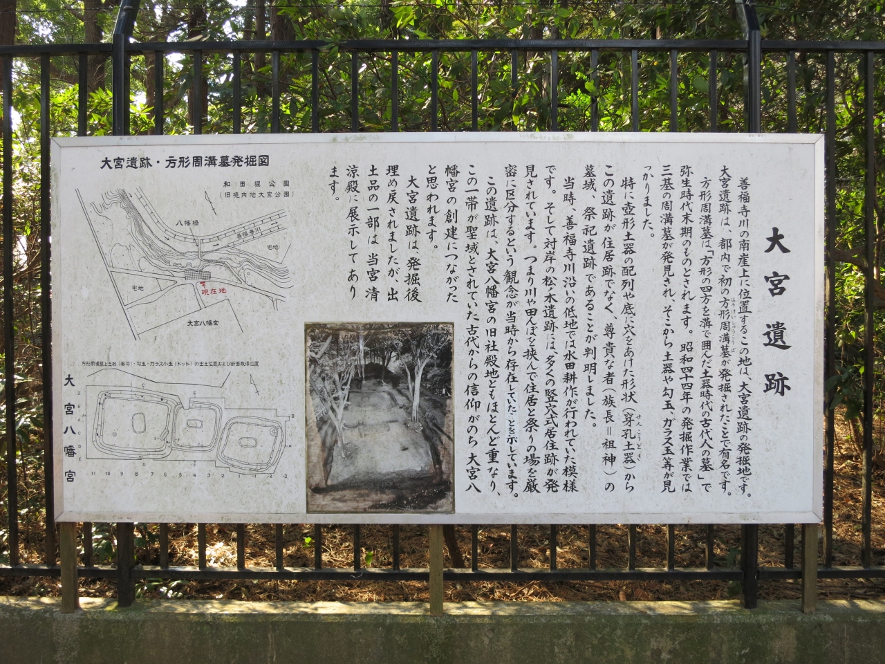 大宮八幡宮に隣接する和田堀公園内の高台にある遺跡です。1969(昭和44)年の発掘調査で、弥生時代終末期の方形周溝墓三基が近接して発見されました。23区内で初めて発見された方形周溝墓は、弥生時代の族長の墓と見られ、東京都指定史跡として保存され、出土土器は区の指定文化財となっています。善福寺川周辺の歴史を教えてくれる場所です。