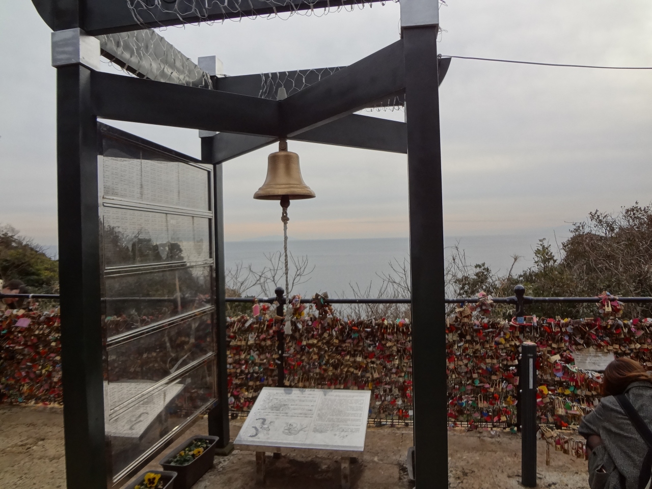 ガイドブックで見たことのある「恋人の丘「龍恋の鐘」」、そこには想像以上の南京錠がかけられていました。相模湾を望む光景と、その前に設置された鐘の美しさもなかなかのものです。残念ながら夕方から雲が広がったので、空の色が今一つでした。