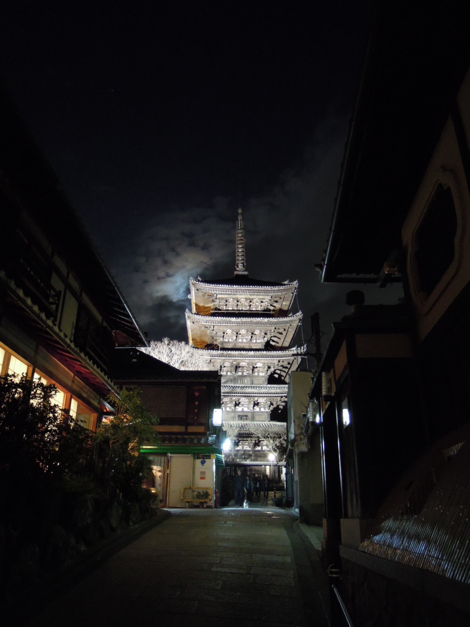 通称「八坂の塔」と呼ばれており、京都観光のランドマーク的な存在になっているんじゃないかと思います。境内は狭いので、この塔以外には観光するところがないのが正直なところですが、ライトアップは非常に美しく、遠目でもわかります。