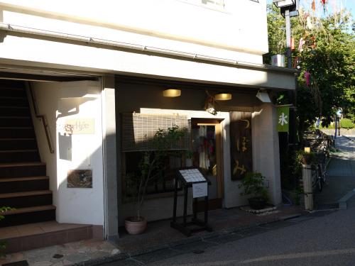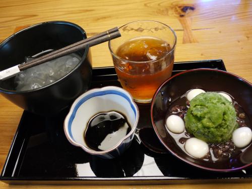 くずきりがおいしいと評判のお店のようですが、抹茶みぞれも食べたくなったので「くずきり+抹茶みぞれ」セットにしました。冷たい加賀棒茶もついてきて、うれしいセットだと思います。