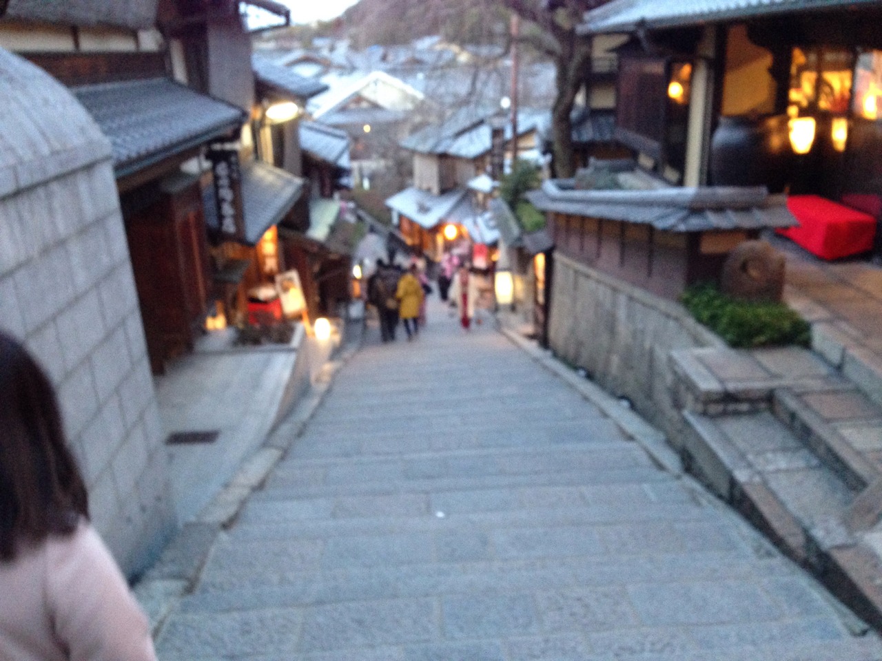 この坂の両脇には、お土産屋や飲食店が立ち並ぶ、京都有数の観光スポットです。2月のシーズンオフですが、薄暗くなった夕暮れ時だというのに台湾人韓国人などのアジア系観光客がたくさん歩いていました。女性受けしそうな小洒落たお店が多いですね。