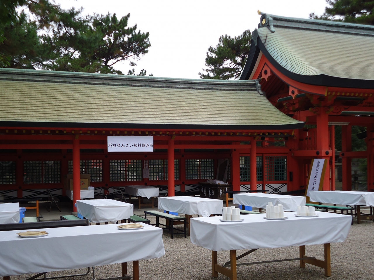 第一本宮でのお祭のあと、境内では厄除けぜんざいが振る舞われ、参拝者で賑わいました。