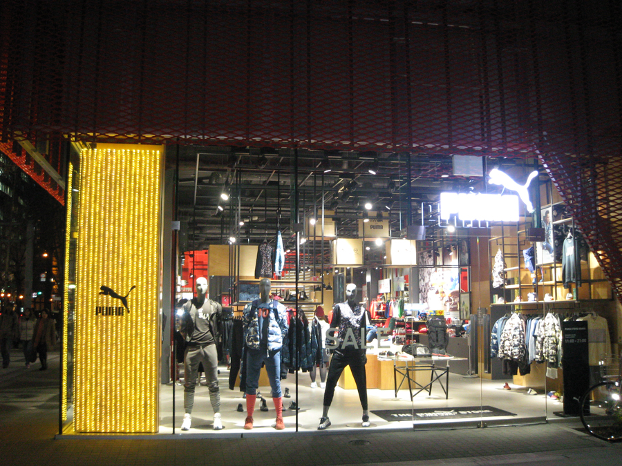 御堂筋沿いにある、大きくて真っ赤なビルです。ロゴもマークも夜空にくっきり目立ちます。
