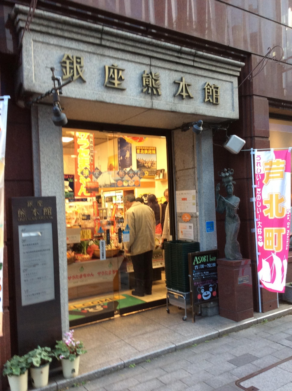 外堀通りの数寄屋橋交差点を新橋方面に少し歩いていくとあります。熊本県のアンテナショップです。色々な特産品や地酒などがありますが、結構多くのアイテムがくまもんでパッキングされています。からしレンコンが有名ということでお試しで購入しました。