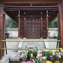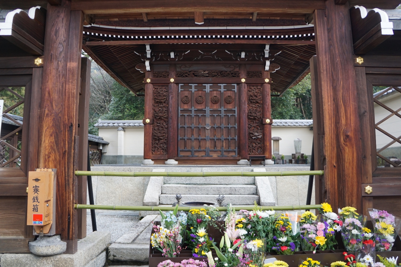 霊山本廟は、三年坂の下に参道入り口があります。石畳の参道から、石段を登って、さらに境内を奥に進むと、一段高くなったところに廟がありました。さすがに、廟にはさっき活けたばかりのような花がたくさん手向けられていました。