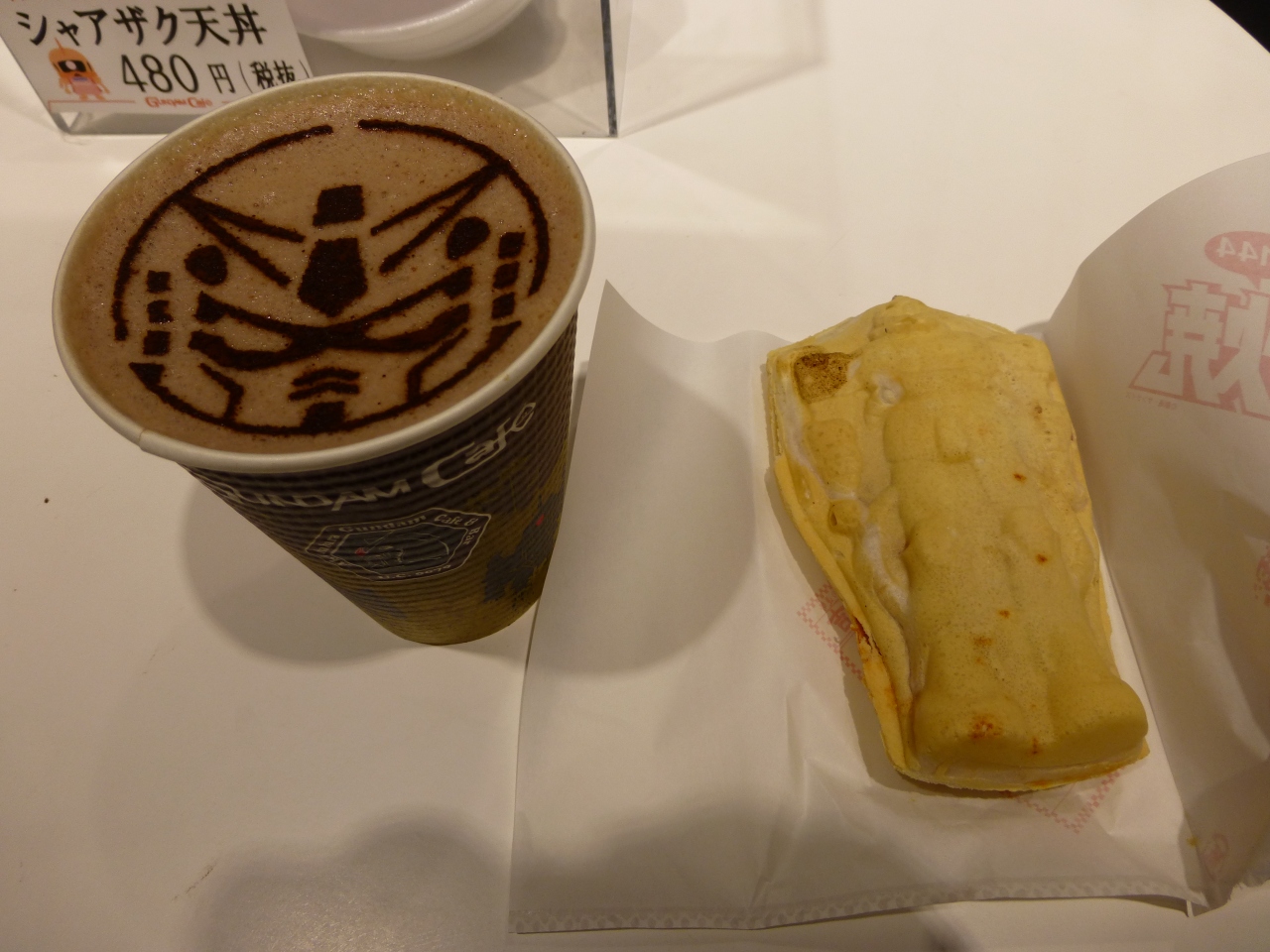 夜のガンダムライトアップを見ていたら,この時期(2月)は冷えますし,プログラムの間は20分ほどあるので,寄ってみました.ガンダムのグッズなども売っていますが,上からココアパウダーを落としてガンダムの顔を描いたココアやガンプラ焼き・天丼などがありました.店員さんもとても親切で,よかったです.