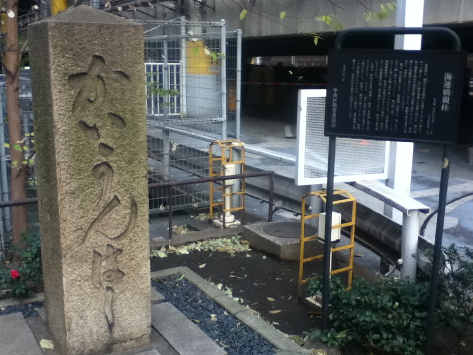 地下鉄日本橋駅の北東、昭和通りの東側にある。東側の上を首都高速が走っている路地の角に小さな緑地にこちらの石柱と説明板が立っている。石柱には、ひらがなで大きく、かいうんはしと刻まれている。週末午後のせいか、自動車や歩行者は大変少なく、こちらを見ている人はいなかった。石碑のみなので観光要素は少ないが、元々開運橋と呼ばれ、楓川が日本橋川に合流する入口に架けられていて、明治になって海運橋と改称された。関東大震災で破損し架け替えられたが、楓川の埋立てに伴い撤去された。特に橋梁やこの界隈に関心や知識がある方には、訪問することをお勧めする。