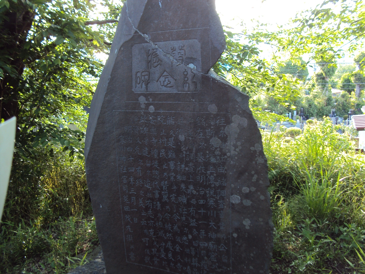 寒川町の駅から15分くらい歩いたところにあります。安楽寺の南側というつもりで行くとわかりやすいでしょう。丘の上には碑がありますが、関東大震災で倒壊して破損したらしく、一部が欠けています。丘の上までは細い道ですので、車椅子では無理です。