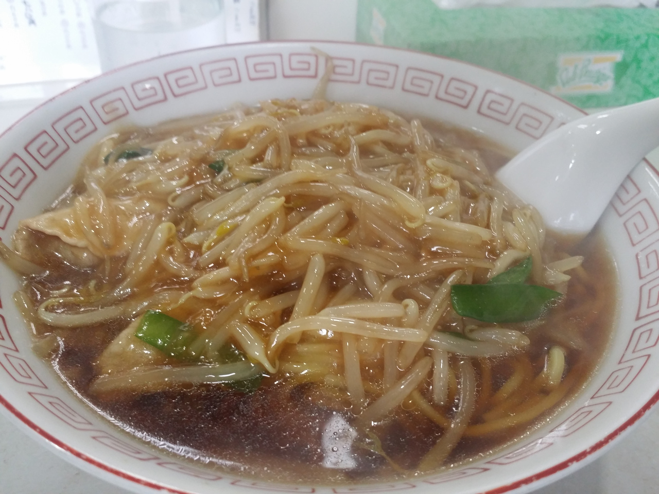 交差点の角にある昔ながらの中華料理店。席はカウンターと奥に数席のこじんまりした店。12時前には満席で店内で数人が行列。おすすめは、タンメンとあんかけもやしラーメン。威勢のいいお姉さんに注文をすると!あんかけもやしラーメン 600円