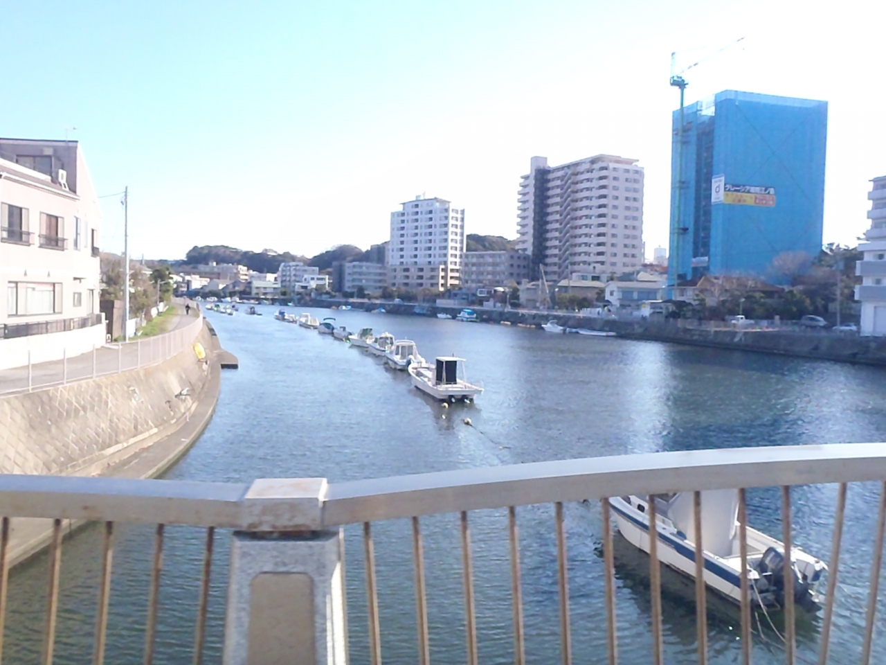 江の島から藤沢市方向を眺めると、江ノ島え向かって流れ込む河川が境川です。