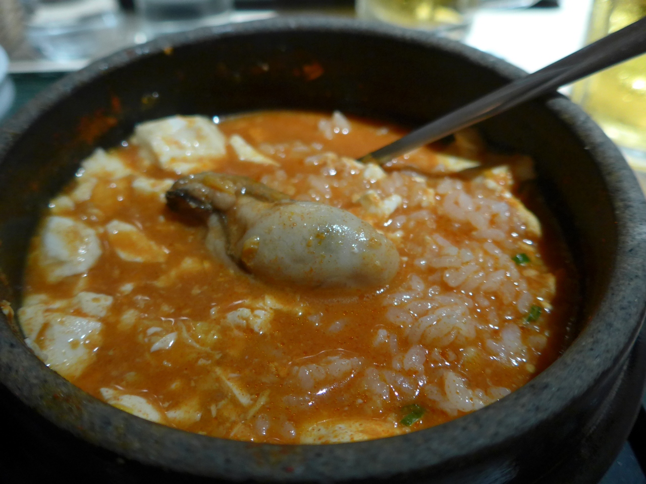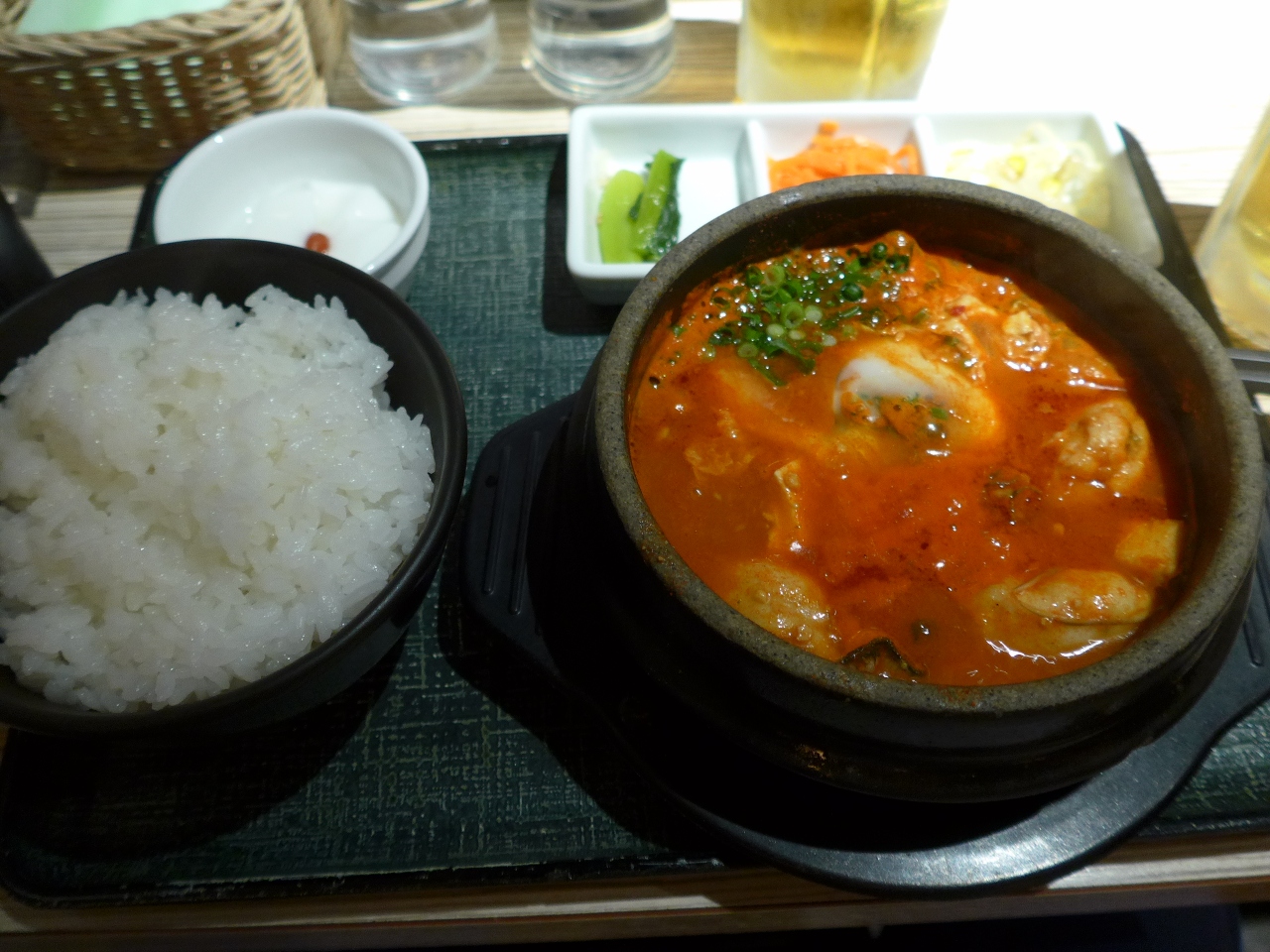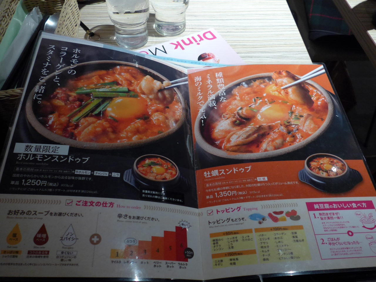 地下一階のお店ですが1階の入り口付近には写真入のメニューがあるので直ぐに判ります。寒い日だったのでオーダーした限定のホルモンスンドゥブと牡蠣スンドゥブが身体の芯から温まりました。