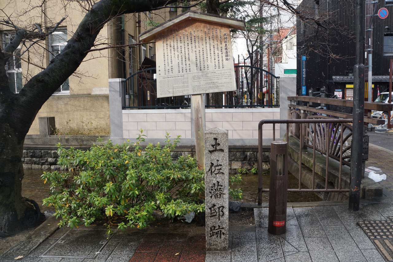 京都の土佐藩邸跡は、高瀬川沿い。伏見にも土佐藩邸があって、こちらは鳥羽伏見の戦いの際、板垣退助らが藩の命令を無視して、薩長に加わるといった話があるのですが、こちらの藩邸はあまりそうした動きがわからない。討幕に傾く、薩長に対して、大政奉還を主導したのは土佐藩。徳川幕府の力がやはり必要というのが山内容堂の考え方。その考え方は時代の本流からすれば、少し、地味な存在だったのかもしれません。