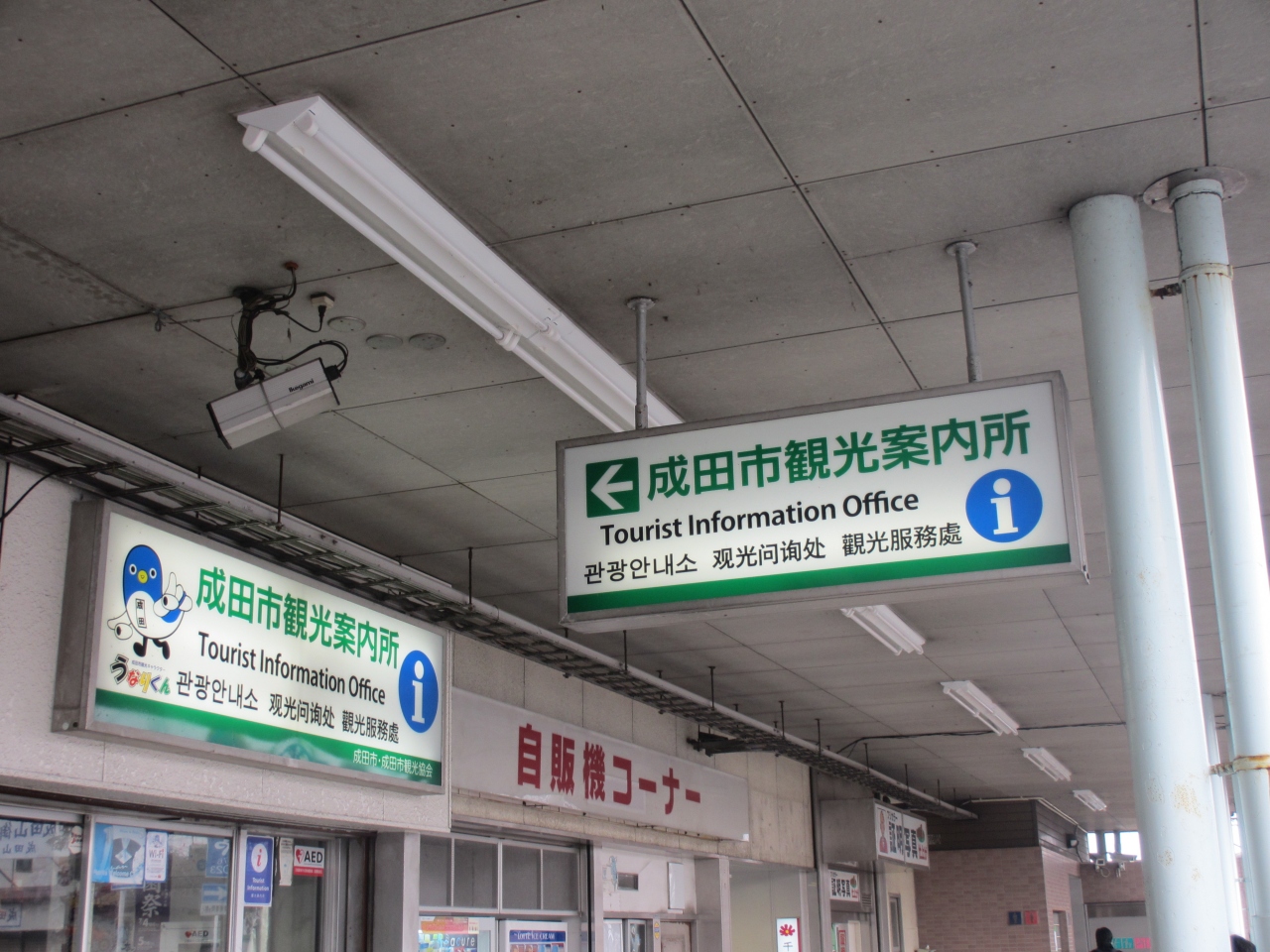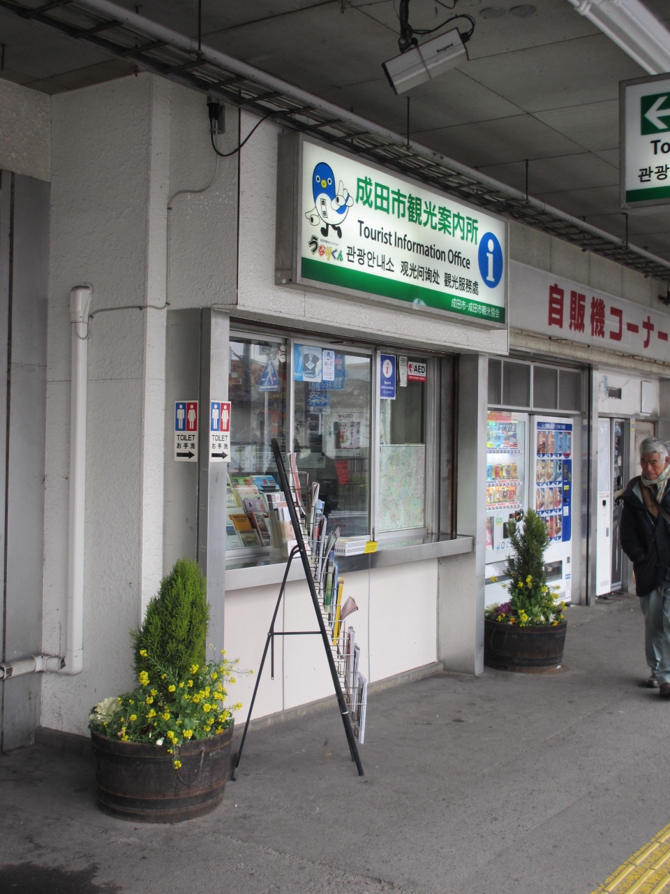 JR成田駅の改札口を出たら左に行き外に出たら左を見ると、外に面してはいますが駅舎の建物の中に観光案内所があるのがわかります。タクシー乗り場の斜め向かいです。私は、こちらで近隣の地図と新勝寺のパンフレット(どちらも無料です)をいただいて、散策を開始しました。