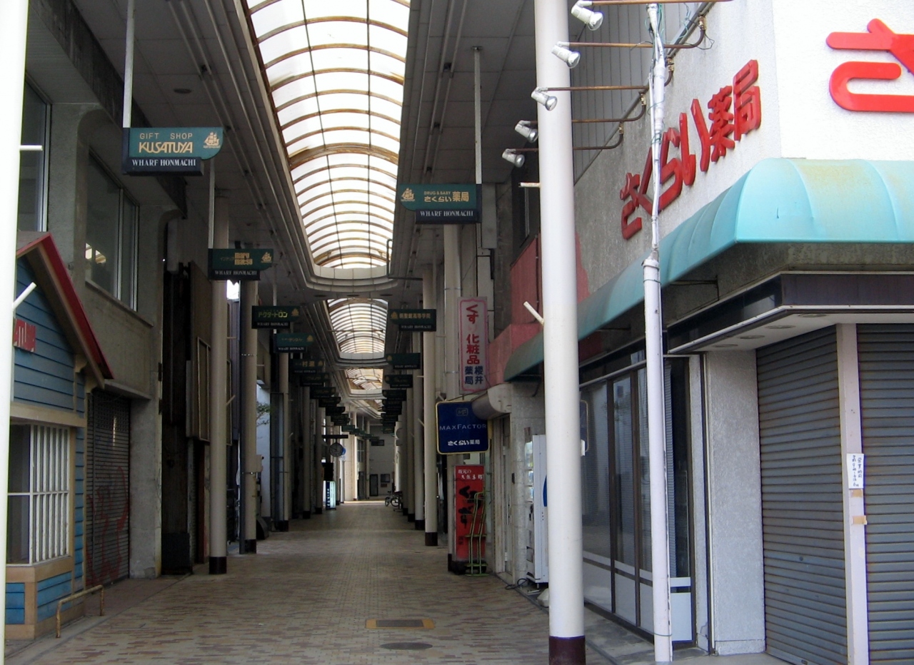 さて本町商店街はさくらい薬局を起点に富屋街商店街と分岐して東側に向かう商店街です。東終点は南北に通る通り町商店街と交差します。商店街内は天井部に明かりとりが付いているアーケードとなっており、中々レトロで趣のある香川県大手の114銀行があるこなどから寂しくなっている丸亀のこの地域の商店街の中ではまだ賑やかさが残っている方ではないのでしょうか。