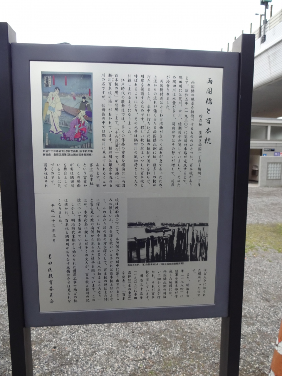 両国橋のたもとに墨田区教育委員会が設置した「両国橋と百本杭」の案内板があり、それに詳しく説明が為されています。